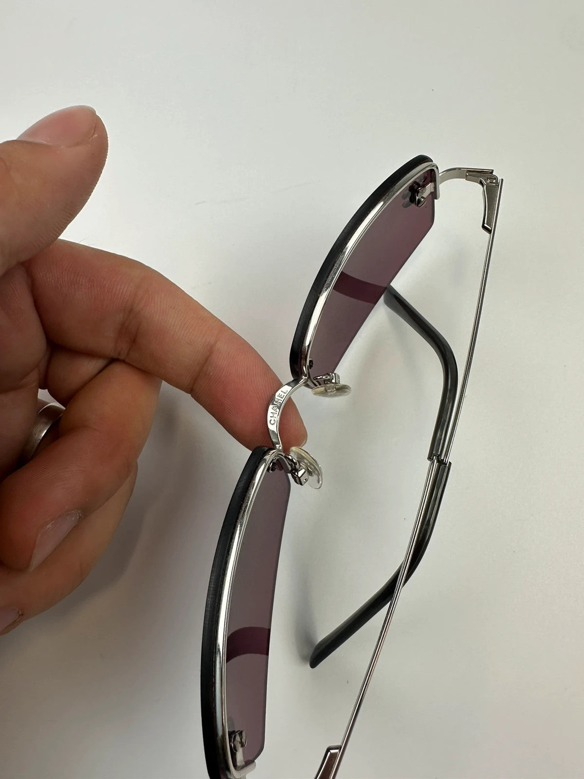 Chanel rimless sunglasses with double CC logo in rhinestones, green–purple tint