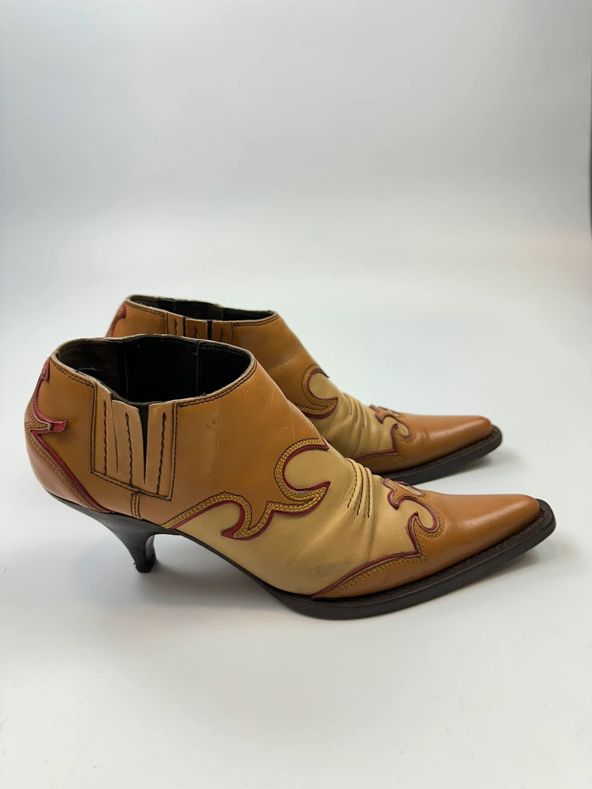 Miu Miu 00’s Cowboy Santiags Heels Ankle Boots Beige Brown Leather Pointy Toe