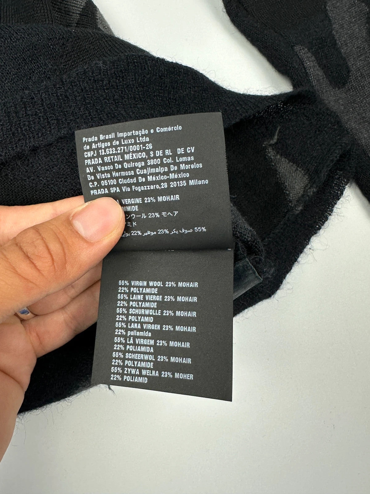 Wool and mohair sweater from Prada Milano in navy, black, and grey, from the Fall–Winter 2016 collection.