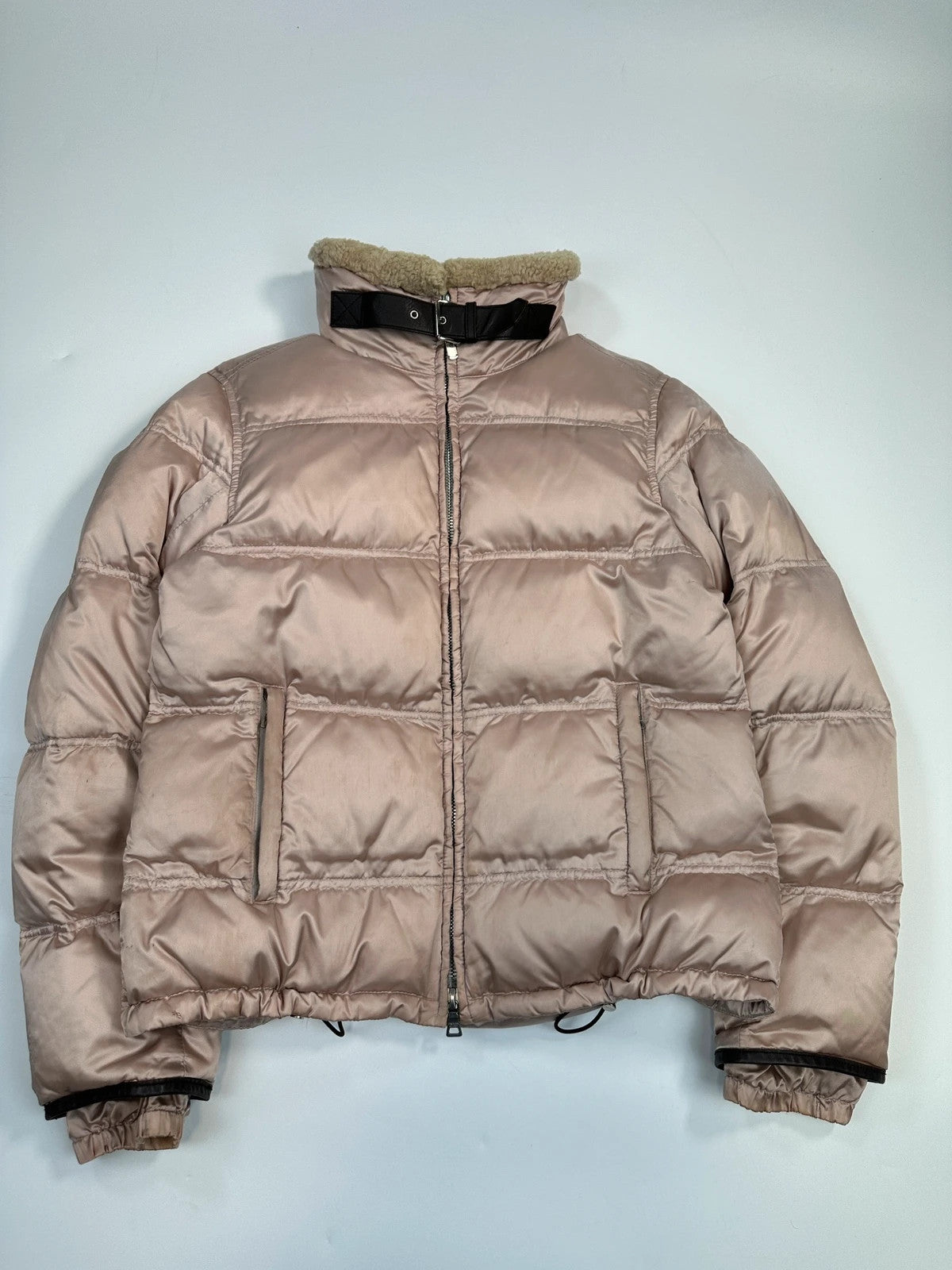 Prada Sport FW2003 Light Pink Shiny Patent Nylon Down Puffer Shearling Collar Jacket