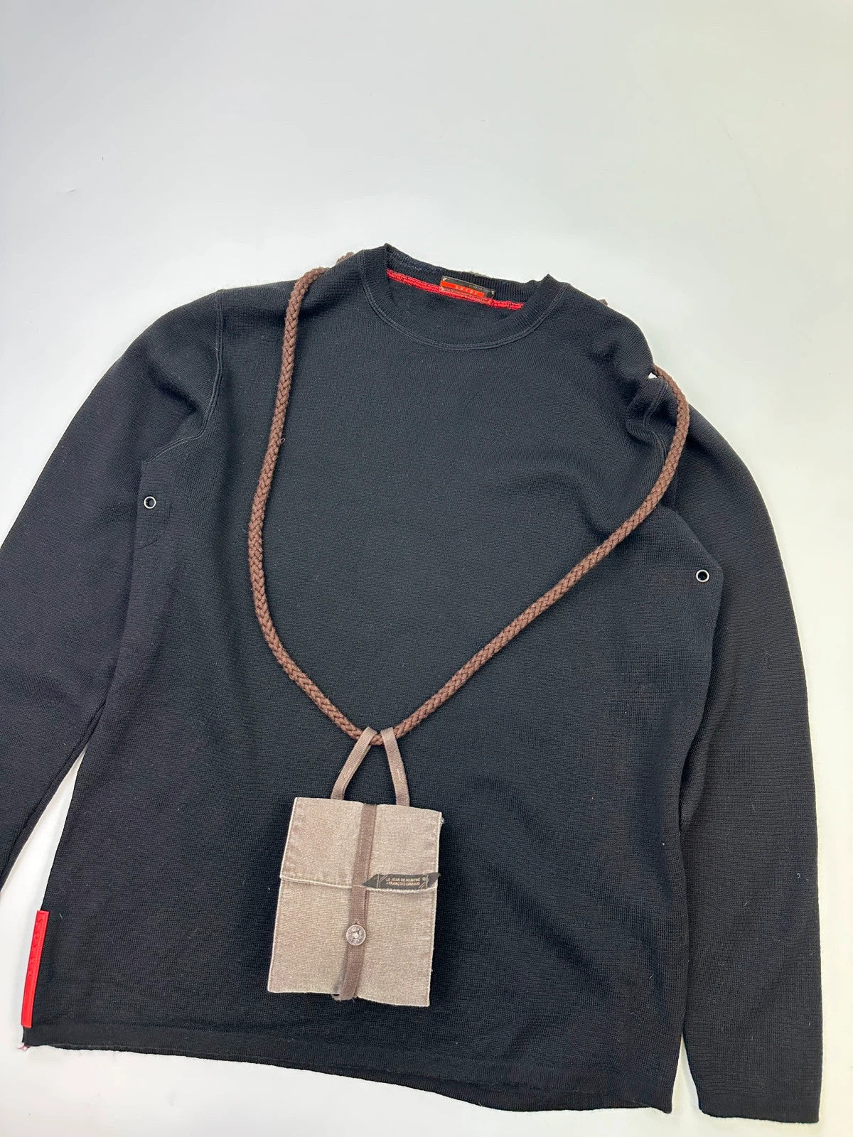 MFG pouch from the 90s with a strap that allows it to be worn in multiple ways depending on the outfit.