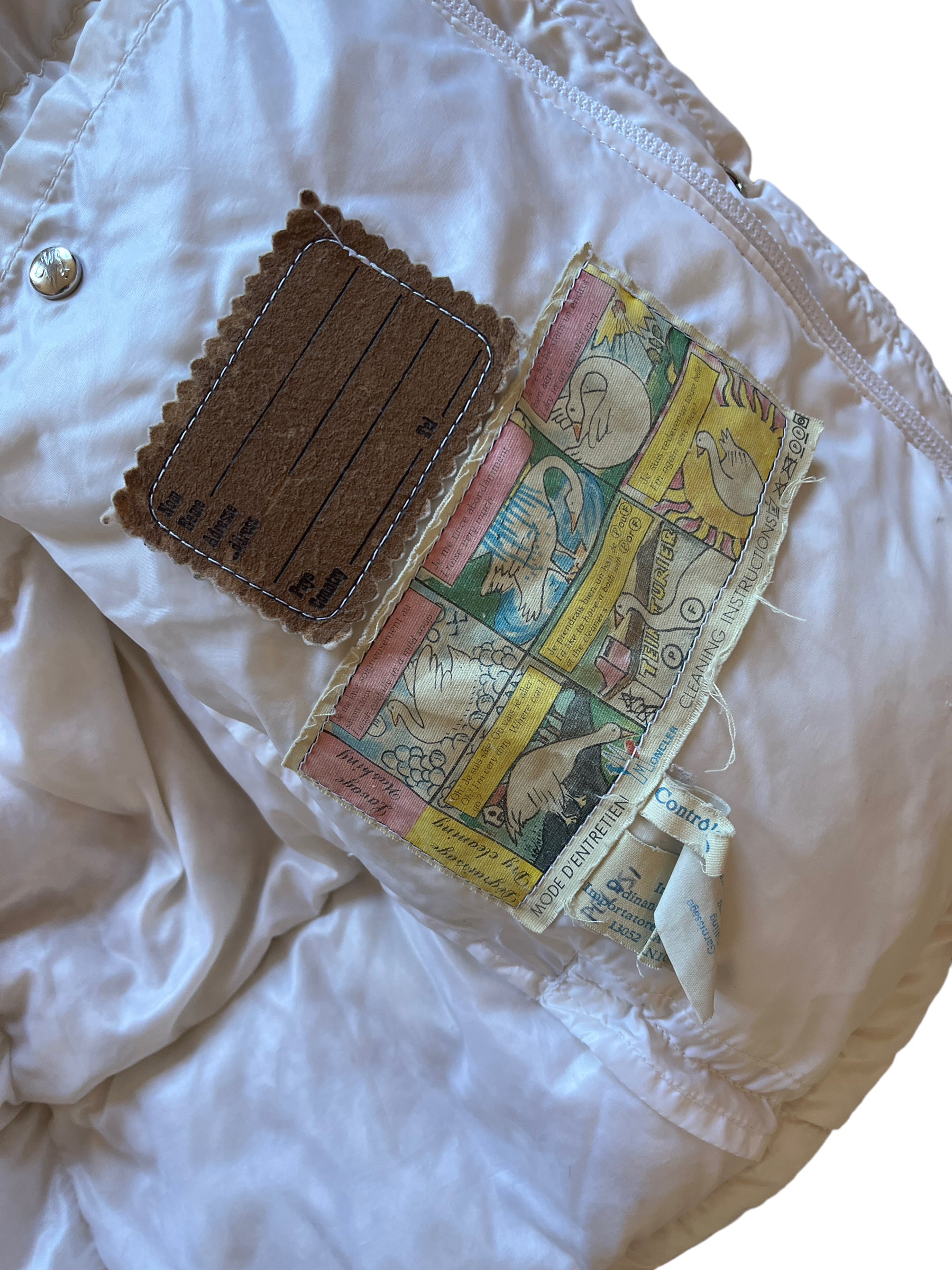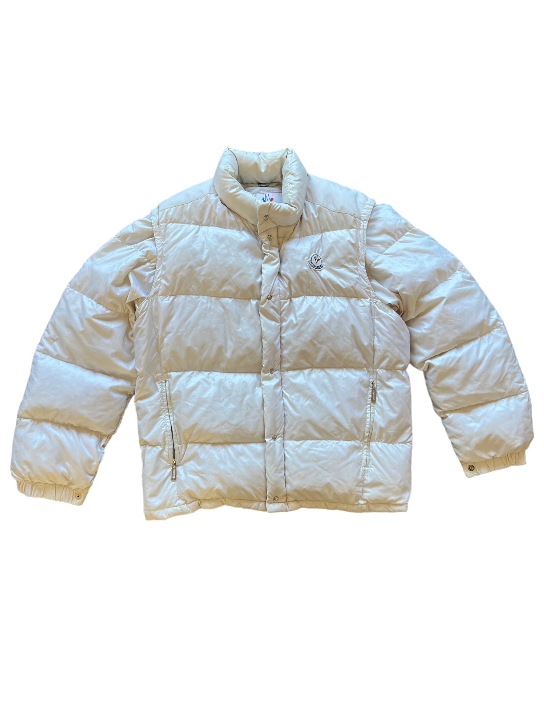 Moncler puffer jacket with removable sleeves. Comes in white colorway with some small stains (one is no visible since the zip cover goes on top)