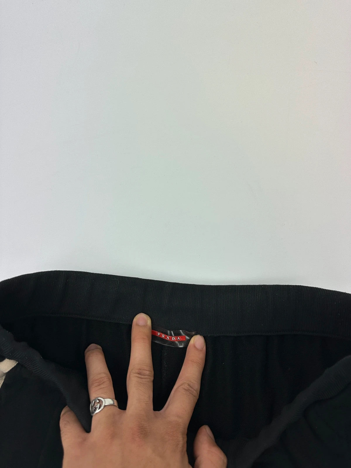 Dark black jogging pants with side stripes from Prada Sport from the Autumn - Winter 2002 collection in cotton and elastane, adjustable at the waist, wide cut.